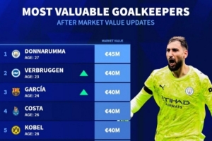 门将身价排行榜:多纳鲁马4500万欧第一,维尔布鲁根第二拉亚第七