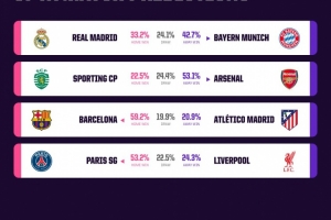 Opta预测欧冠首回合:拜仁胜皇马概率42.7%,巴萨胜马竞概率59.2%
