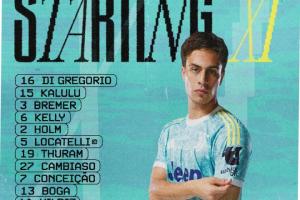 尤文首发:16-迪格雷戈里奥、15-卡卢卢、3-布雷默、6-凯利、2-霍尔姆、5-洛卡特利、19-K·图拉姆、27-坎比亚索、7-孔塞桑、13-博加、10-伊尔迪兹